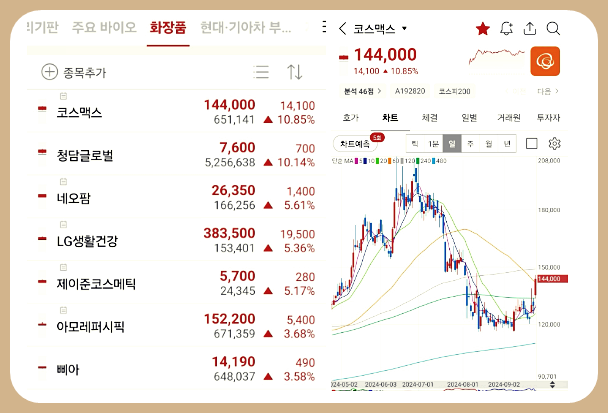 신한투자증권에서 발표한 리포트에 따르면, 중국 법인의 실적 개선 가능성이 높아질 것으로 전망된 코스맥스가 10% 급등했습니다. 이 외에도 창담글로벌, 네오팜, LG생활건강, 제이준코스메틱, 아모레퍼시픽 등 주요 화장품주들도 긍정적인 흐름을 이어갔습니다.